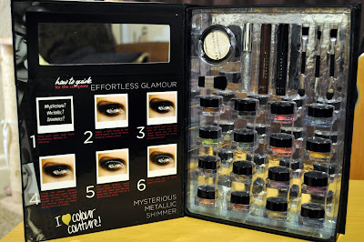 The set contained a highlighter, a glitter eye liner, mascaras in black and brown, 8 loose pigments and 8 crème shadows. Also inside the box is a mirror and a tutorial to help you create a metallic smoky eye.